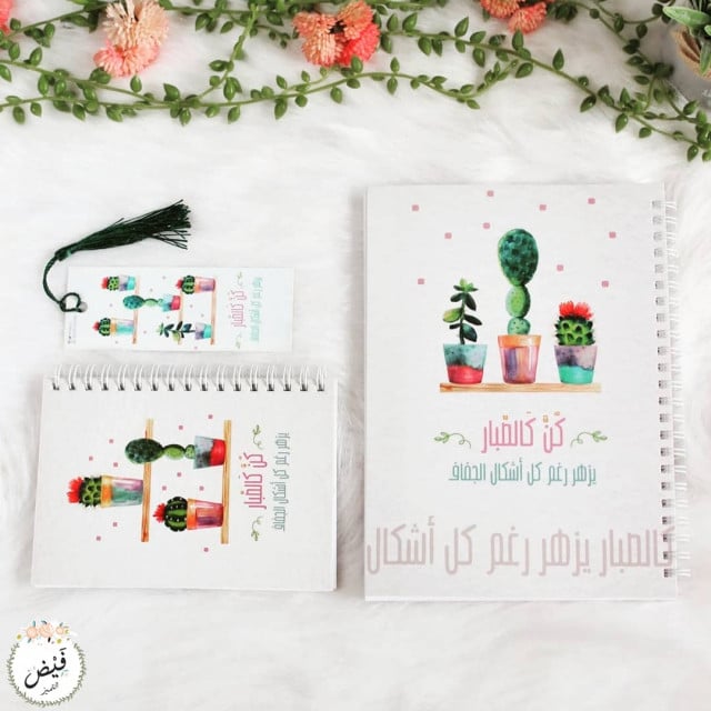 المجموعة مزينة بعبارة " كن كالصبار يزهر رغم كل أشكال الجفاف "